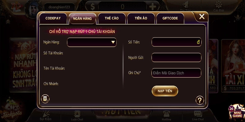 • Cổng game hỗ trợ nhiều phương thức gửi tiền như: Codepay, chuyển khoản nhanh qua ngân hàng, thẻ cào hay tiền ảo.